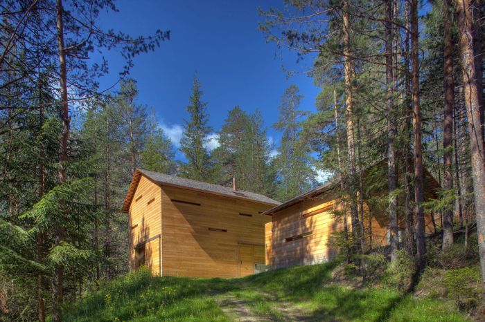 Hausbau / Holzhaus: Inmitten des Waldes bei St. Vigil in Enneberg steht anstelle des einstigen Jagdhauses ein Holzhaus ganz besonderer Art: Die Mountainlodge Tamersc. Gefertigt in traditioneller Blockbauweise, aber ohne überstehende rustikale Eckverbindungen, mutet das Holzhaus sehr modern an und fügt sich dennoch harmonisch in die Landschaft. Mehr noch treten Haupt- und Nebengebäude in einen Dialog mit dem Wald, der sie umgibt.